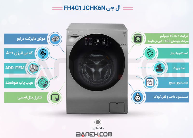 مهمترین مزیت رقابتی ماشین لباسشویی lg، طراحی زیبا و مدرنش می باشد. در واقع ال جی با تلفیق کنترل پنل و درب آن، طراحی زیبا و خواستنی را پیش روی همگان قرار داده. البته تنها ظاهر آن نیست که اشخاص را برای خرید ماشین لباسشویی FH4G1 وسوسه می کند، بلکه قابلیت اضافه کردن آیتم « Add Item » نیز در این دستگاه جلب توجه می کند. بدون شک لباسشویی ال جی با دارا بودن یک سری امکانات و برنامه های به روز یکی از بهترین ماشین لباسشویی های موجود در بازار است که حس یک لباسشویی پیشرفته را منتقل می کند. در کنار این همه ویژگی مثبت، ال جی FH4G1JCHK6N از موتور دایرکت درایو، ظرفیت 10.5 کیلوگرم برای شستشو و 7 کیلو برای خشک کردن بهره می برد.