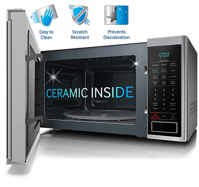 همانطورکه اشاره کردیم سامسونگ یکی از کمپانی هایی است که همیشه سعی دارد تا از تازه های فناوری و ابتکار های خلاقانه استفاده کند. به همین جهت است که برای محفظه ی داخلی مایکروویو و انواع مایکروفرها از لعاب سرامیکی استفاده میکند. پس دیگر لزومی ندارد نگران خراشیدگی دیواره ی داخلی سامسونگ MS40J5133BT باشید چرا که در برابر خراش و سایش و حرارت بسیار مقاوم است و میتوان به سادگی آن را تمیز کرد. مورد دیگر اینکه رنگ آن در اثر زمان تغییر نمیکند چرا که در اکثر محصولات بی کیفیت با محفظه ی استیلی یا اپوکسی شاهد تغییر رنگ محفظه ی داخلی بر اثر ماندن روغن یا مواد غذایی رو آن ها هستیم. بهعلاوه لعاب داخلی از قابلیت انتی باکتریال هم برخوردار است که از رشد باکتری ها در این محیط جلوگیری میکند. در کل باید بگوییم این محفظه طول عمر بیشتر با طبخ بهتر به نسبت سایر دیواره های داخلی دارد.